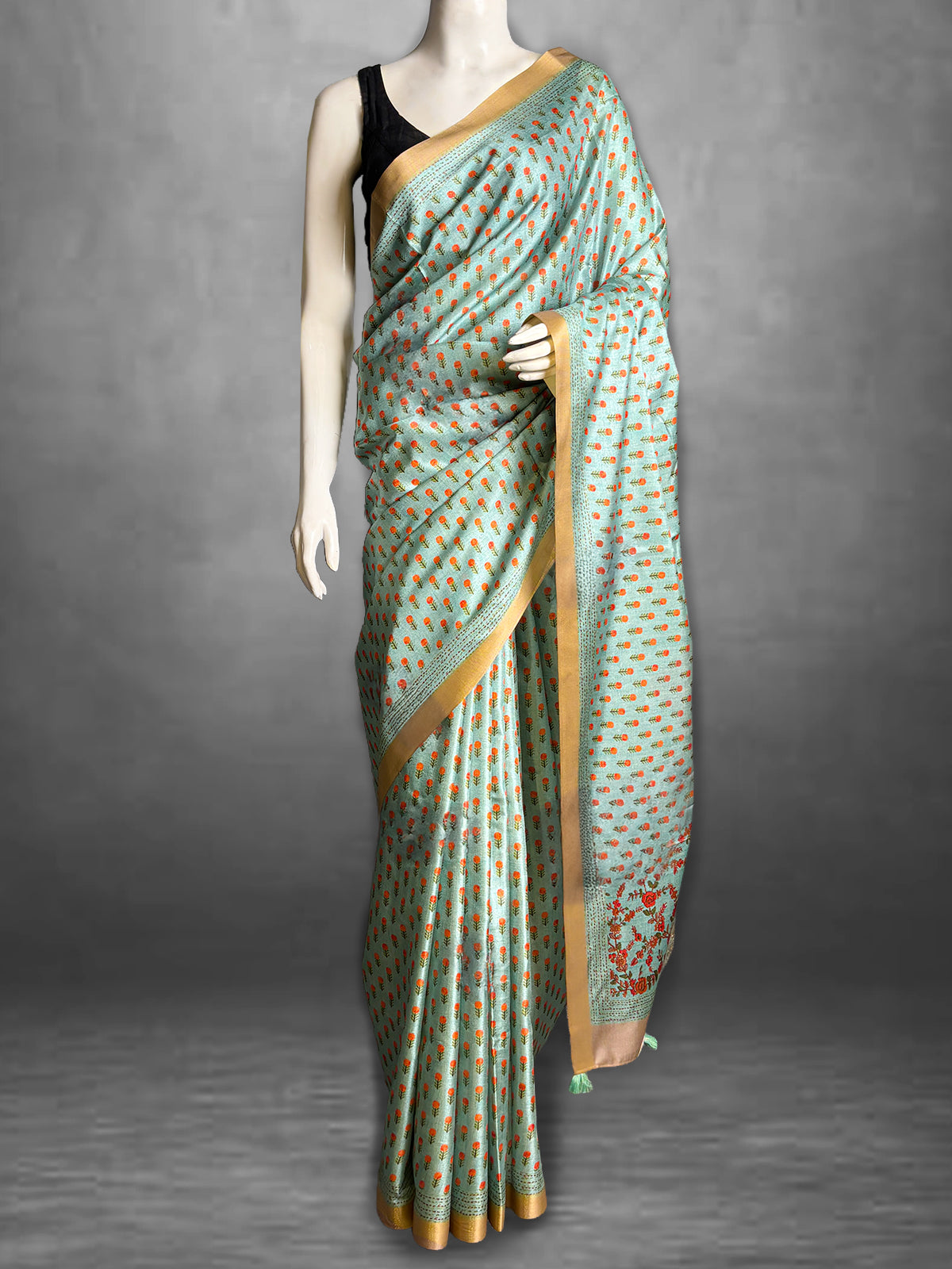 Light blue tussar printed saree with floral butis all over, floral pallu with unstitched blouse attached